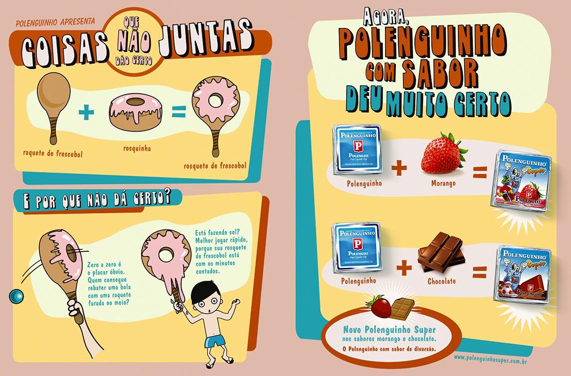Polenguinho decided to mix cheese, chocolate and strawberry and we made a fun campaign with the stories of Mixed up Characters.